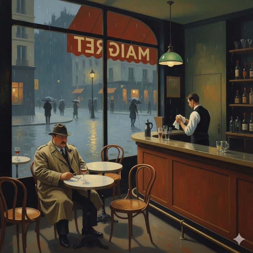 Simenon blickt aus dem Fenster: „Einsamkeit… ja. Ich war umgeben von Menschen – Frauen, Freunden, meinen Kindern – und fühlte mich oft furchtbar allein. Meine Figuren spiegeln das wider. Sie sitzen in Cafés, in Hotels, in fremden Zimmern und können nicht sagen, was sie wirklich fühlen. Sie sind eingesperrt in sich selbst.“
